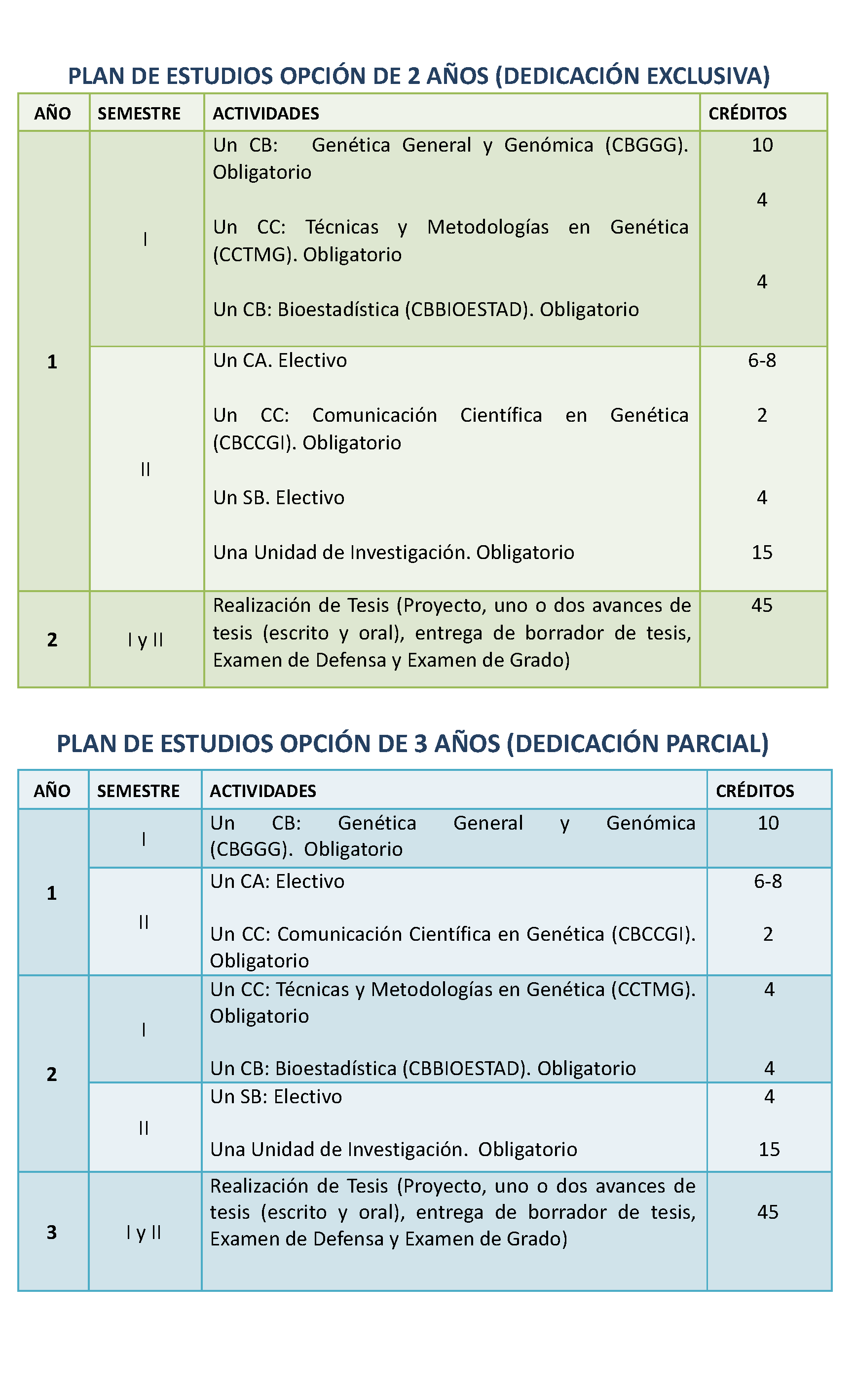 - "Otorgar una formación de nivel avanzado en el campo de la Genética, tanto en sus conocimientos teóricos como en la de sus aplicaciones, que le permita al alumno un desempeño profesional superior, pudiendo además aportar a la profundización del conocimiento en el área de la Genética".